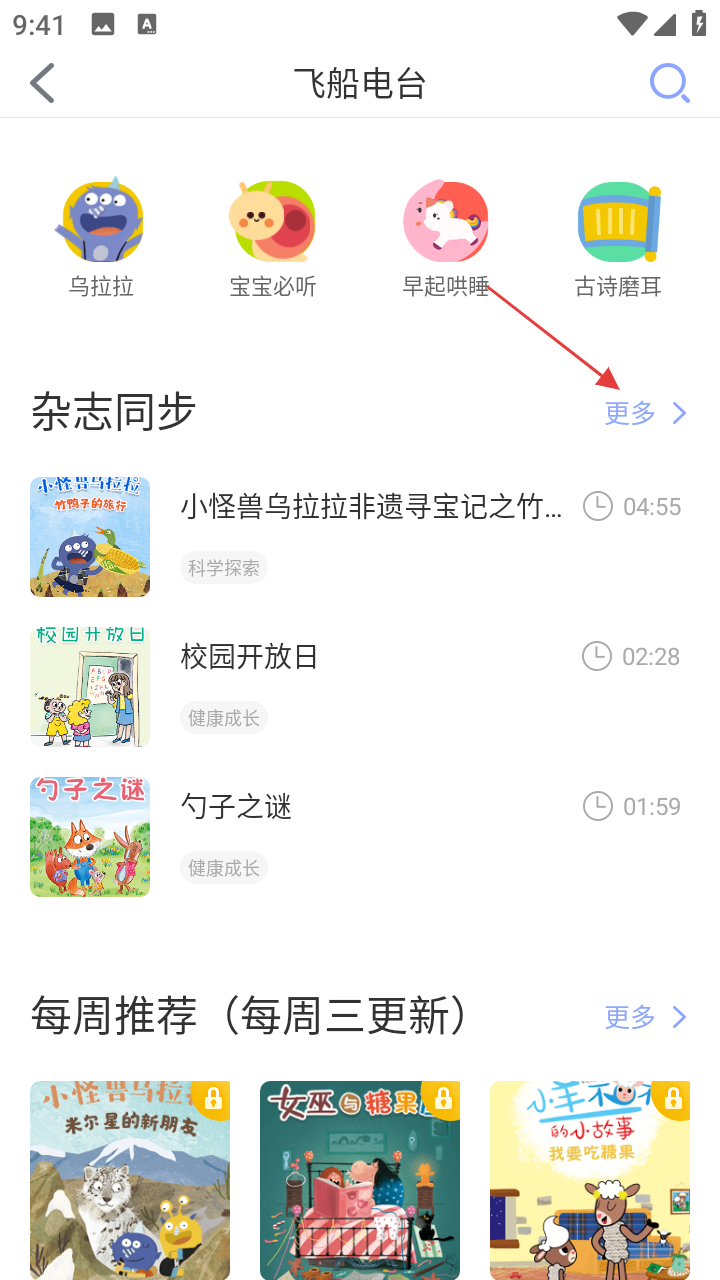 2、在飞船电台页面,点击杂志同步右侧的更多按钮,查看更多杂志同步内容。