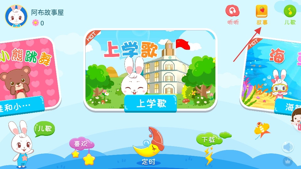 1、选择对应内容:打开软件后,根据孩子的兴趣与需求,在故事、儿歌、动画、诗词分类中选择对应内容,点击即可开始播放,操作简单易上手。