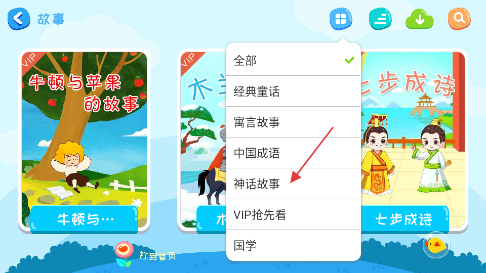 3、在展开的分类中,点击神话故事选项,筛选出神话故事内容。