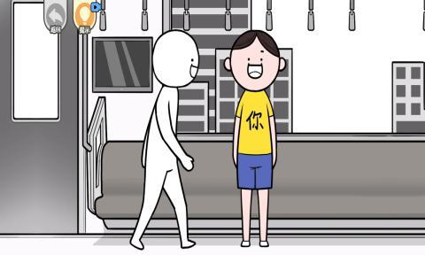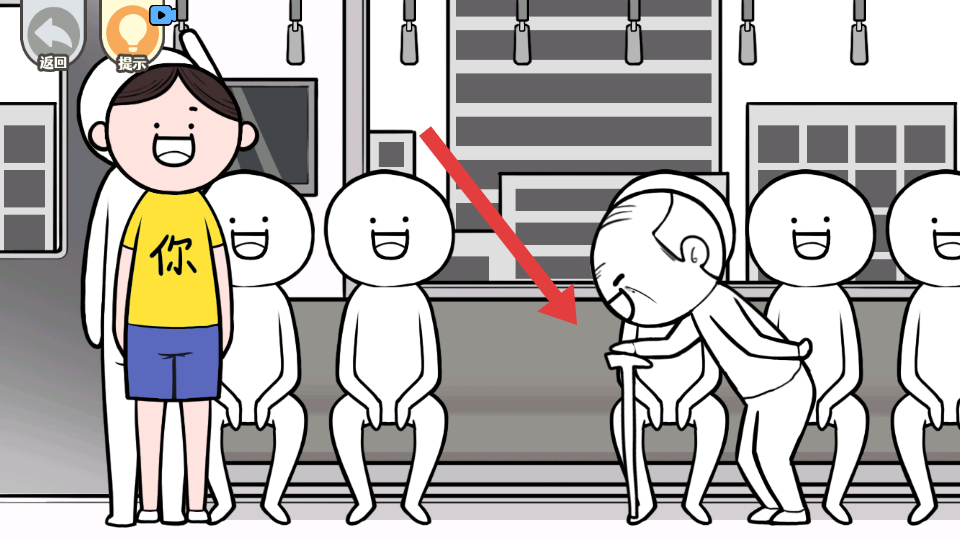 1、在地铁场景中,看到箭头指向的需要帮助的老人时,可进行互动,比如主动让座,完成善意行为相关的游戏任务。