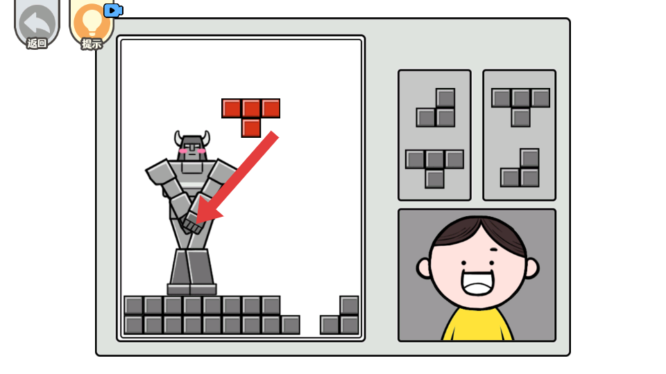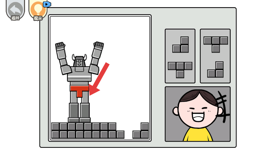 2、在机器人拼图关卡,按照箭头指示,将红色方块放置到机器人对应的部位,逐步完成机器人的组装,推进解谜进程。