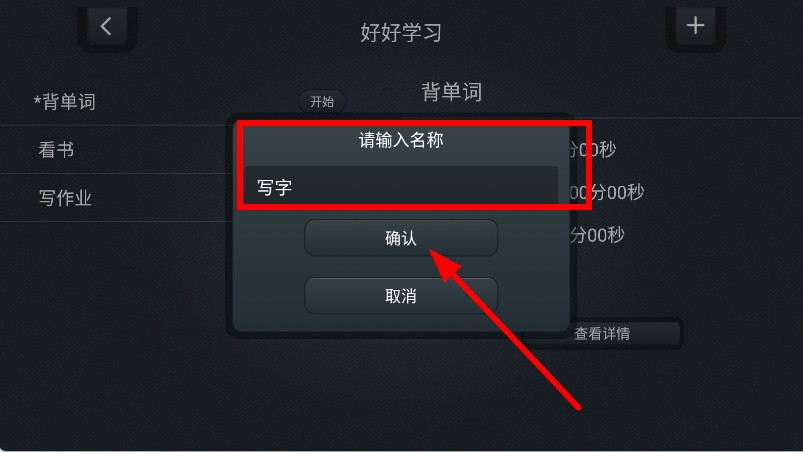 3、在弹窗中输入写字,点击确认按钮,创建写字学习计划。