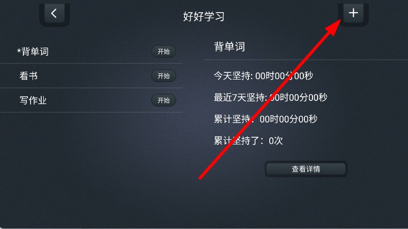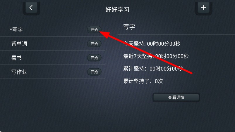 4、回到学习计划页面,点击写字计划旁的开始按钮,进入计时页面。
