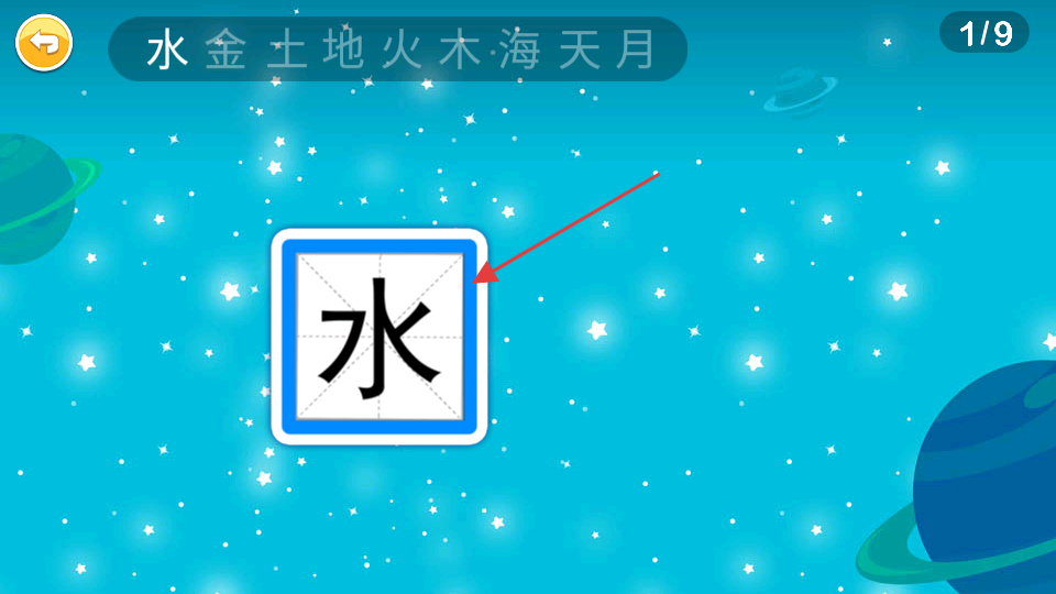 3、在太空馆学习页面,根据顺序先学习汉字水。