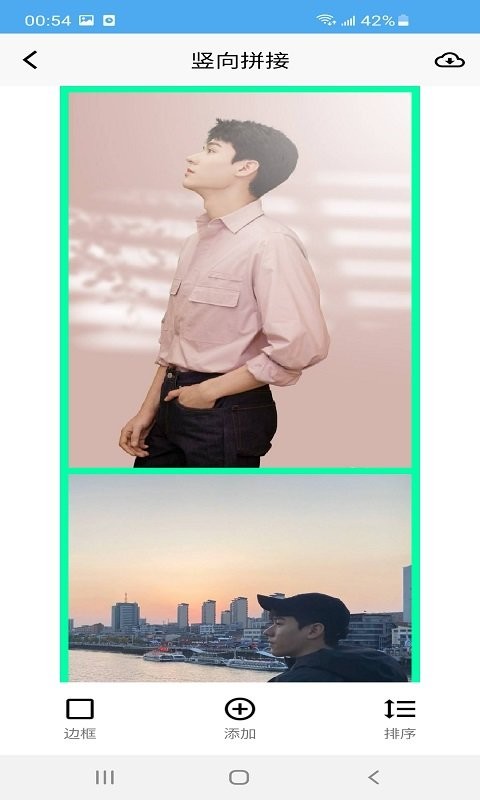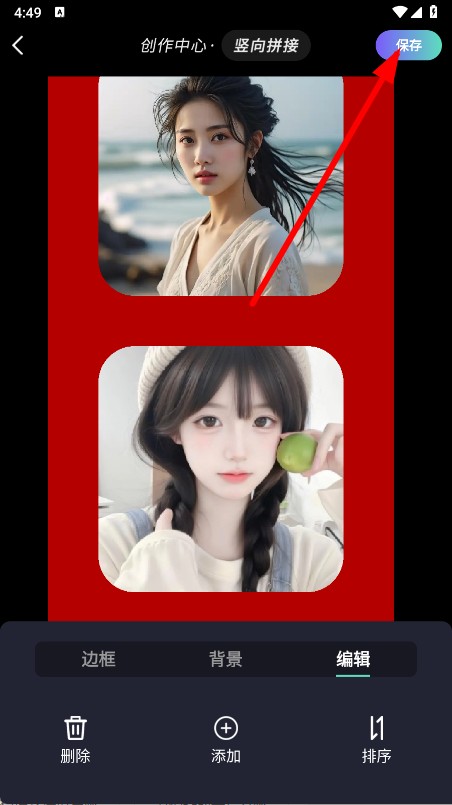 4、编辑完成后,点击右上角保存按钮,即可将制作好的图片拼接长图保存到手机。