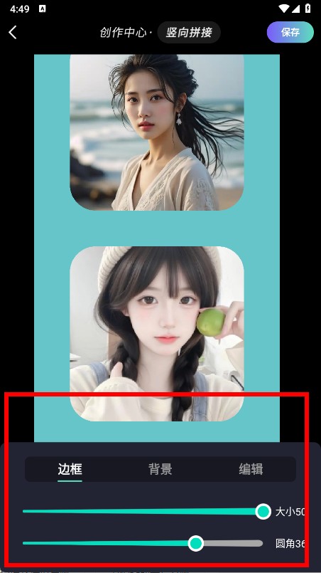 3、在拼接编辑页面,通过功能调整长图的边框大小、圆角、背景颜色以及图片排序等。