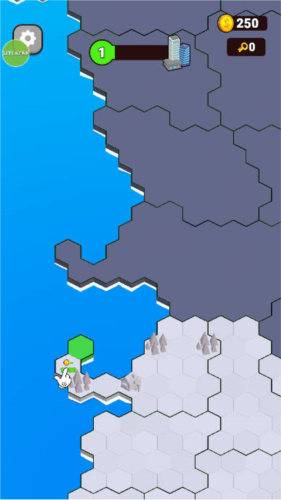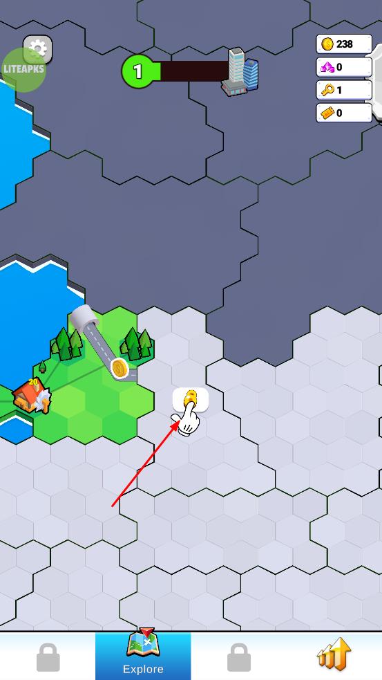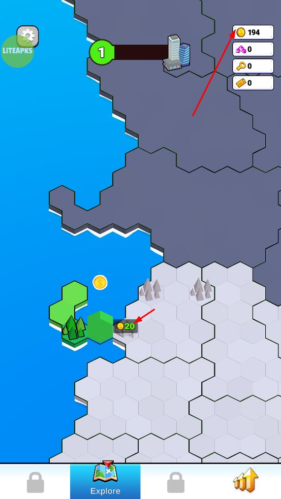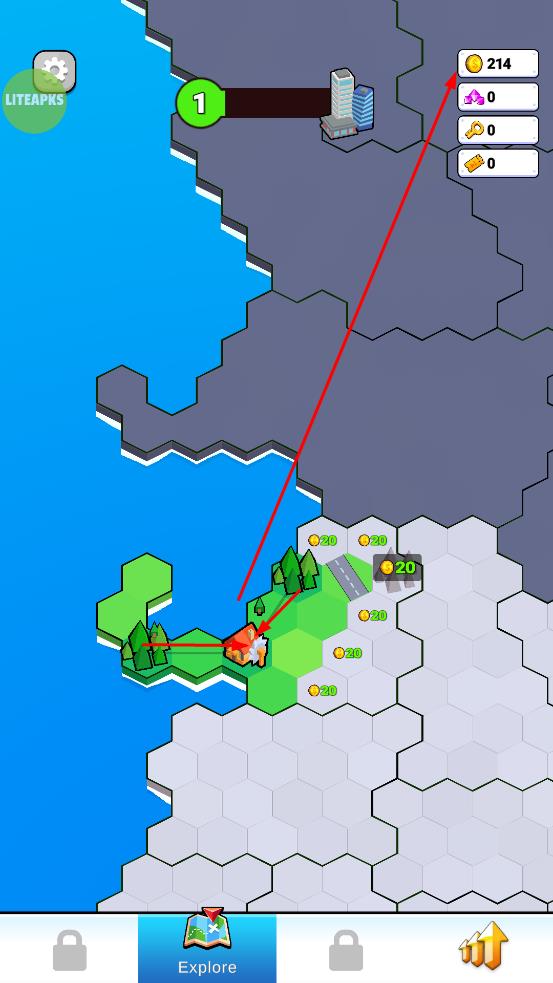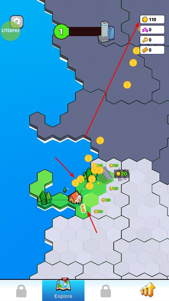 1、在六边形地图中点击标有资源数值的地块,获取金币等资源,积累资源为后续建设做准备。
