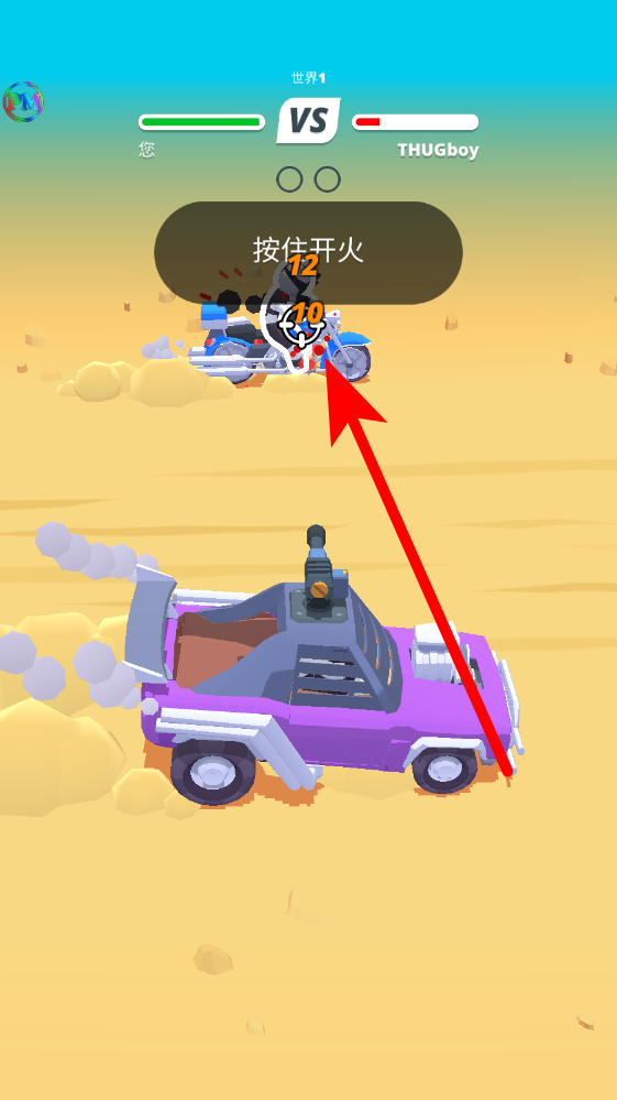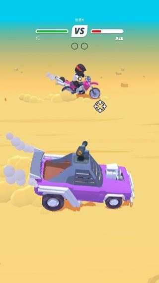 4、在沙漠中驾驶车辆前进,遇到对手时,按住开火键,向对手发起攻击,展开激烈对决,让上方的血条持续的下降,直至胜利。