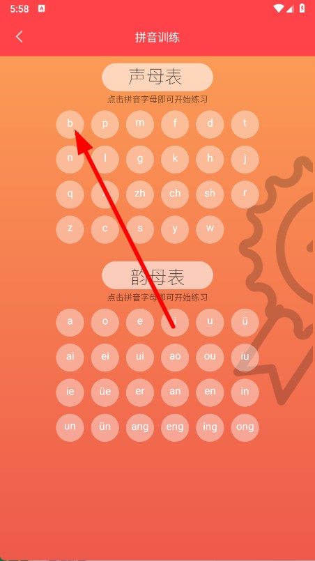 3、在拼音训练页面的声母表中,点击字母,进入拼音训练b页面。