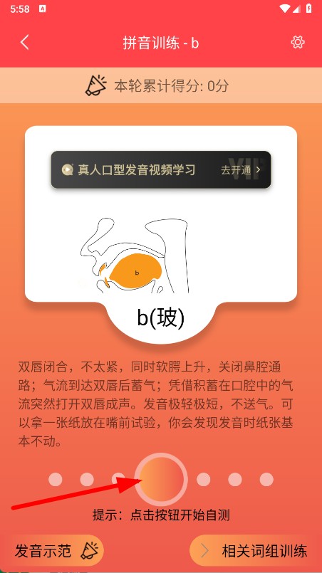 4、查看b的发音图示、文字说明,点击下方按钮开始自测,点击发音示范听取发音示例,进行b的拼音训练。