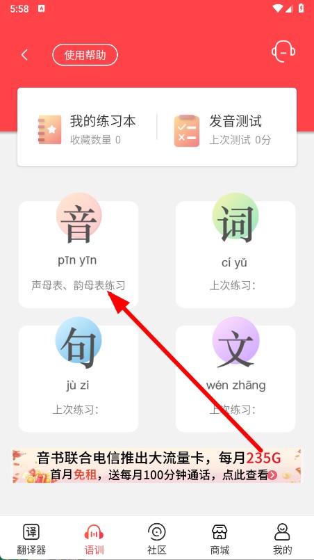 2、在语训页面,点击声母表、韵母表练习选项,进入拼音训练页面。