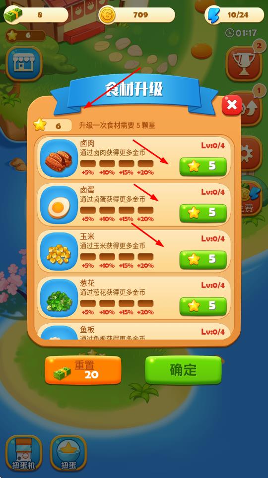 1、进入食材升级界面,消耗5颗星可升级卤肉、卤蛋等食材,升级后能通过对应食材获得更多金币,助力资源积累。