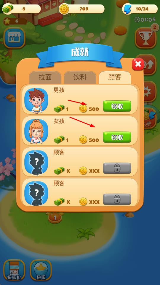 2、在成就界面,完成男孩、女孩等顾客相关成就后,点击领取按钮,获取金币等奖励,提升游戏进度。