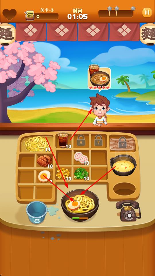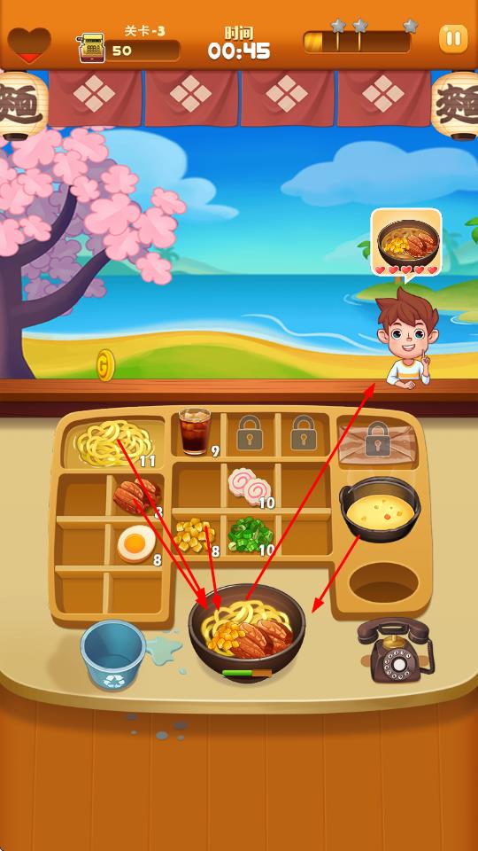 3、在关卡中,根据顾客头顶显示的拉面需求,从食材区选取对应食材放入碗中,制作符合要求的拉面。