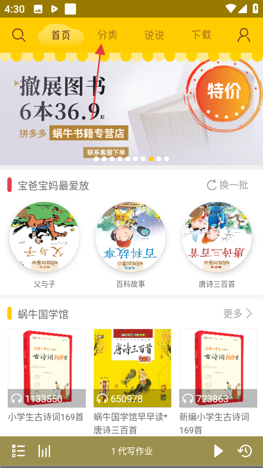 1、在首页,点击顶部的分类按钮,进入分类页面。