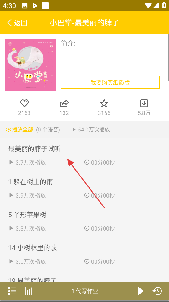 4、在书籍详情页面,可点击最美丽的脖子试听内容进行试听。
