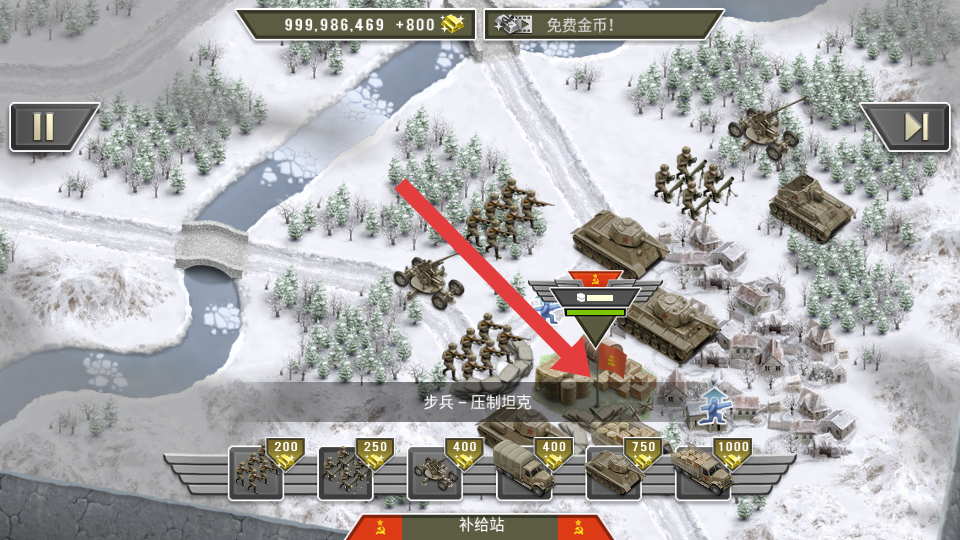 2、合理运用步兵单位执行压制坦克任务,在补给站区域部署兵力,实现对敌方坦克的有效牵制。