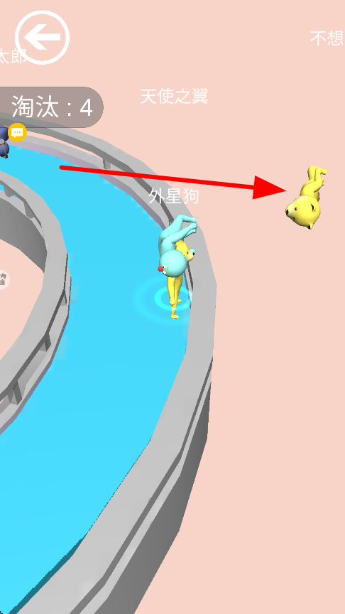 3、赛道上,会遇到其他参与的角色,按照提示比如点击标识,把其他角色抬起扔出赛道,将它们从赛道上淘汰,提升自己的淘汰数。