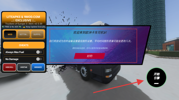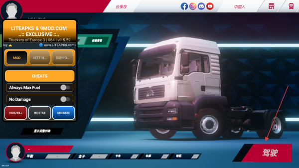 4、购买卡车后,回到游戏主界面,找到“驾驶”按钮并点击,接着在合适时机点击“开始引擎”按钮,即可启动卡车,开始在游戏中进行卡车驾驶操作。