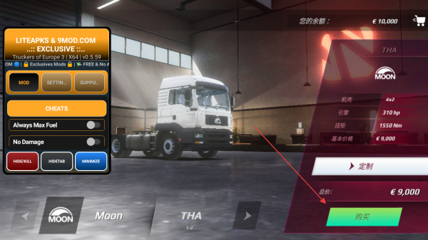 3、创建好个人资料后,进入卡车购买界面,查看不同卡车的机壳、引擎、扭矩等参数,以及基本价格和总价,若确定购买某辆卡车,点击“购买”按钮,获取该卡车。