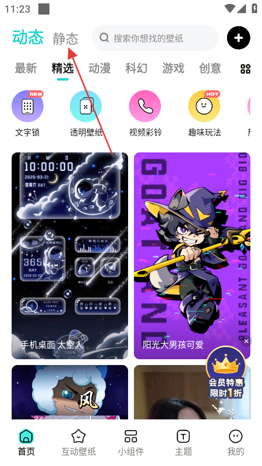 1、在宇宙壁纸首页,点击静态选项,进入静态壁纸页面。