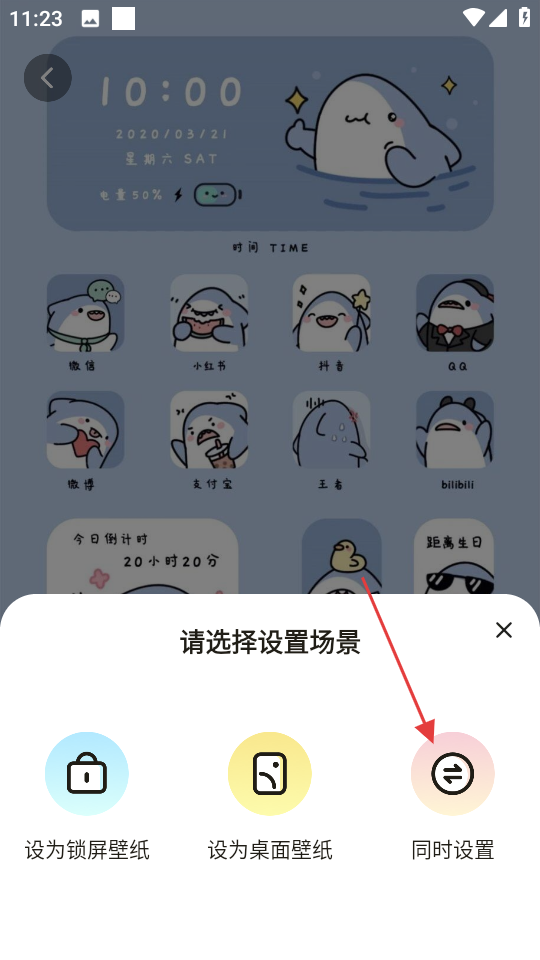 4、在设置场景选择框中,选择同时设置,将该壁纸设为锁屏和桌面壁纸。