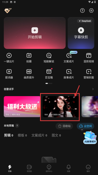 1、打开视频创作应用,点击底部剪辑选项,进入剪辑功能页面。