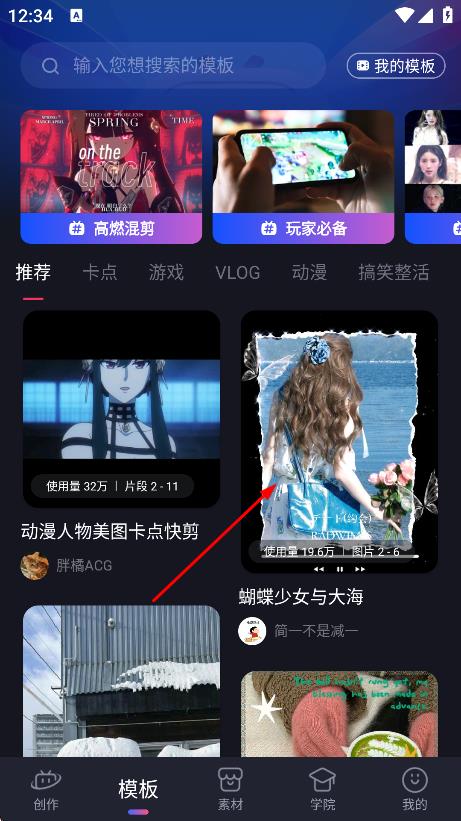 2、在模板页面,挑选喜欢的模板,如蝴蝶少女与大海模板。