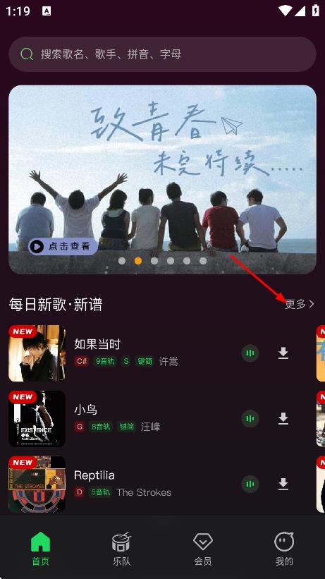 1、点击每日新歌·新谱右侧的更多,查看更多内容。
