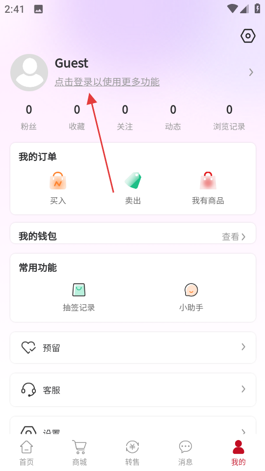 2、在个人页面,点击点击登录以使用更多功能,进入登录页面。
