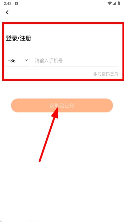 3、在登录注册页面,输入手机号后点击获取验证码。