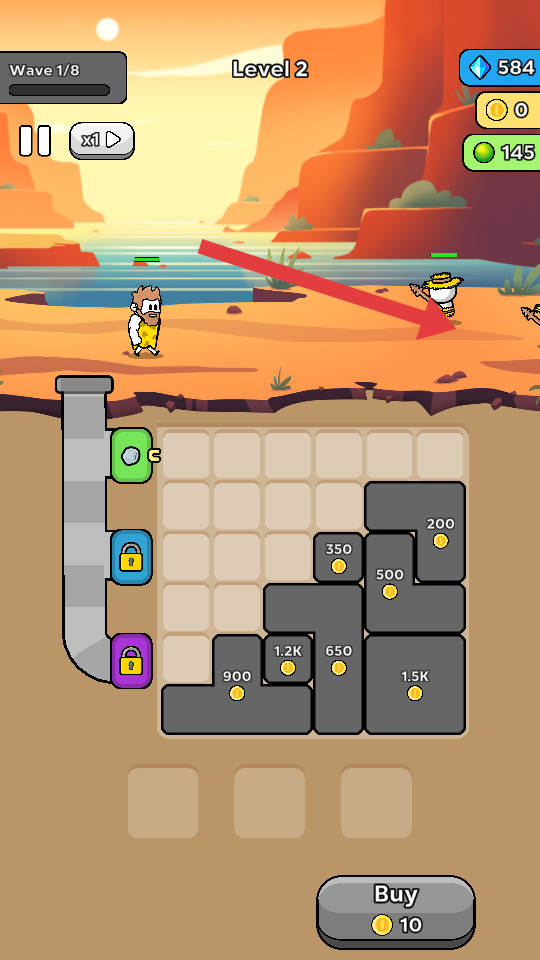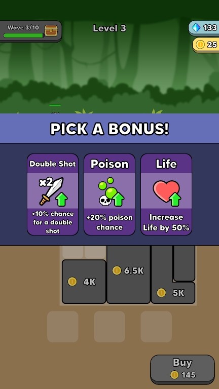 2、点击Buy按钮消耗10金币,提升己方战力或解锁新的攻击方式,助力抵御敌方波次攻击,同时积累更多金币。