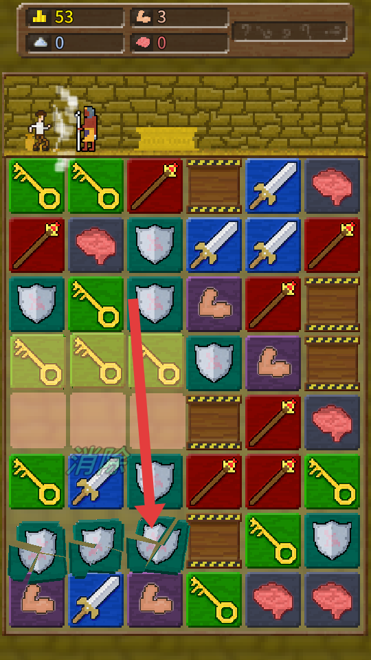 2、针对盾牌方块,通过消除其周围同类型方块,使其破碎,以此削弱敌人的防御,为攻击创造有利条件。