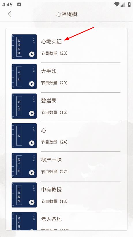 2、在页面,点击心地实证,进入心地实证音频列表页面。