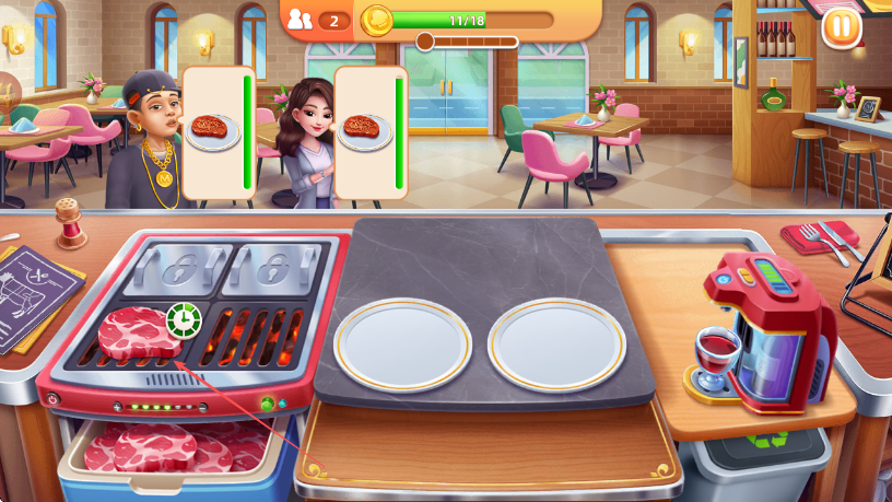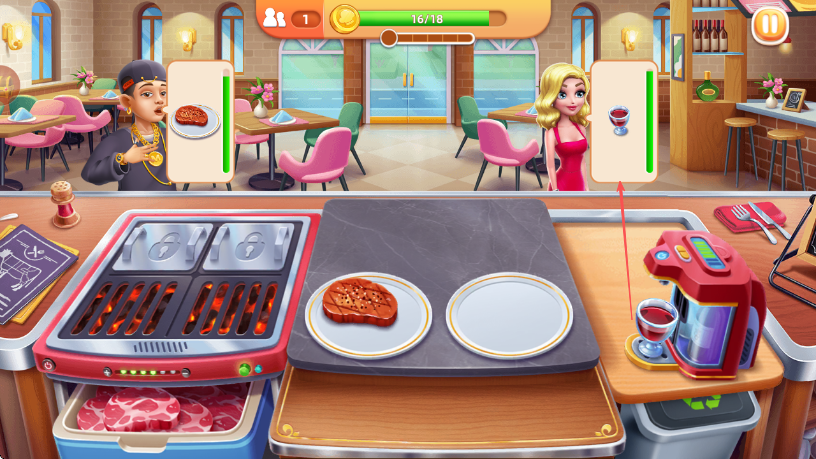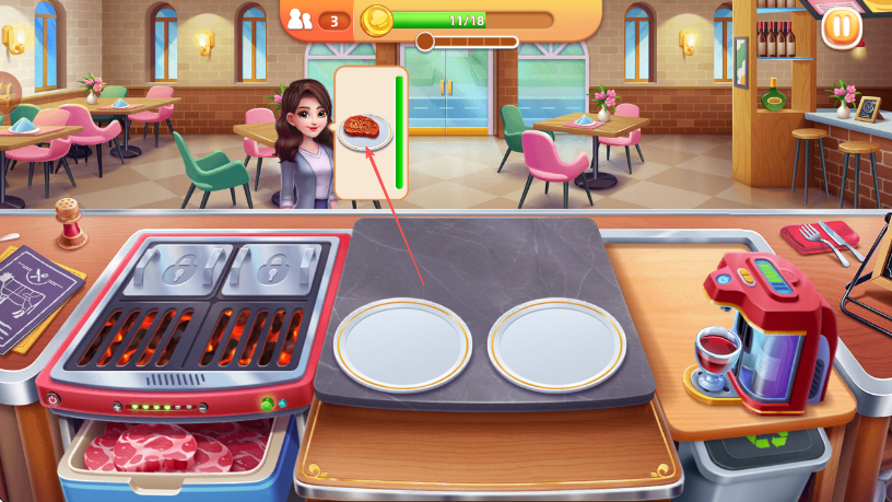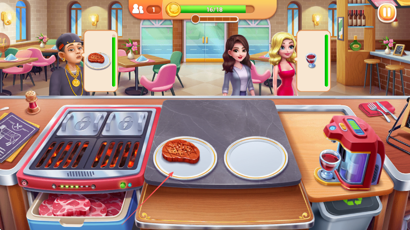 1、进入游戏,留意餐厅内顾客头顶的食物图标,了解他们的需求,比如牛排。