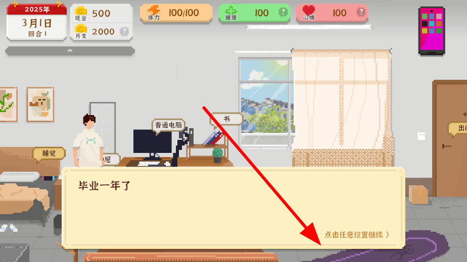 1、新人玩家开始体验,首先进入游戏,会有毕业一年了的提示,点击任意位置继续,开启在我独自生活中的生活模拟之旅。