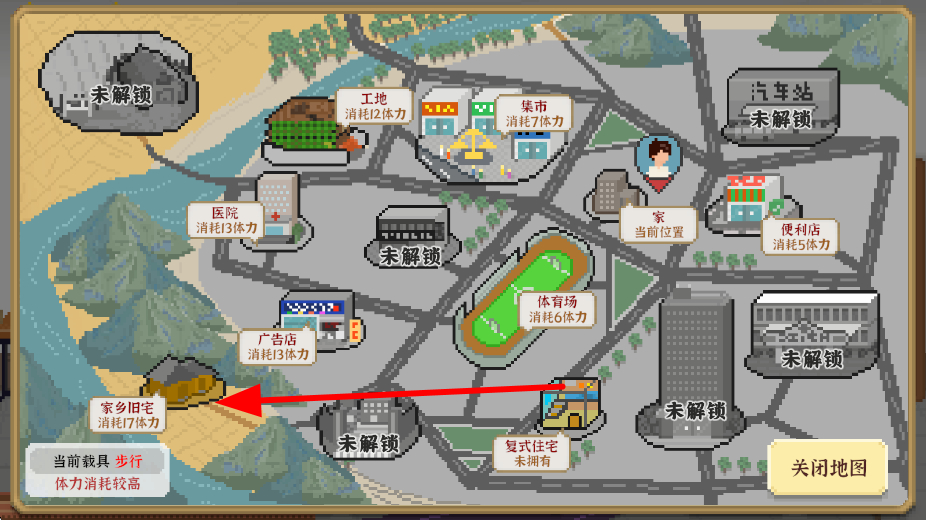 3、查看地图,地图上有工地、集市、医院等不同场景,可选择前往的地点,在场景间移动,消耗相应体力,去体验不同场景的生活内容。