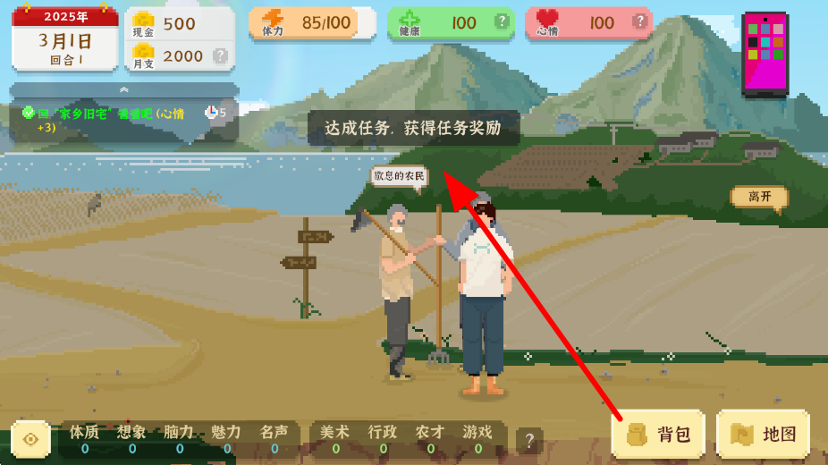 4、到达像家乡旧宅这样的场景后,会遇到任务,完成任务后,能达成任务并获得任务奖励,借助奖励提升自身,更好地体验独自生活。