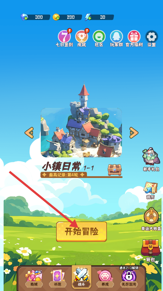 1、进入游戏后,找到小镇日常-1-1关卡,点击开始冒险按钮,开启冒险之旅。