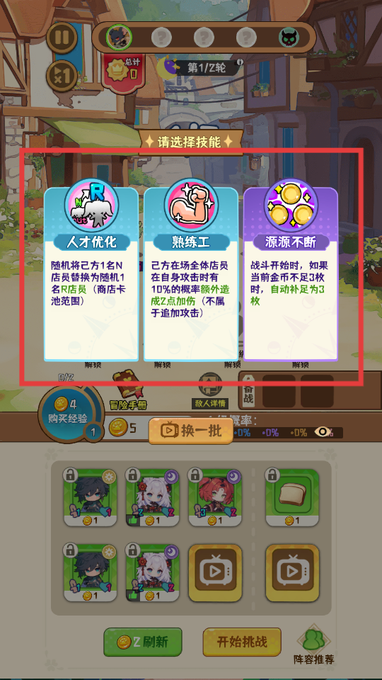 2、进入关卡时可根据需求挑选技能,若需提升店员品质选人才优化,想加攻击选熟练工,缺金币选源源不断。