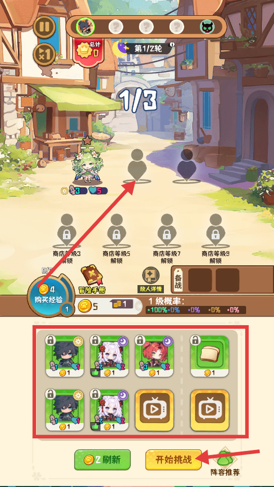 3、在布阵阶段,根据自己的金币数量去购买下方角色,购买后搭配好阵容,点击开始挑战按钮进入战斗。