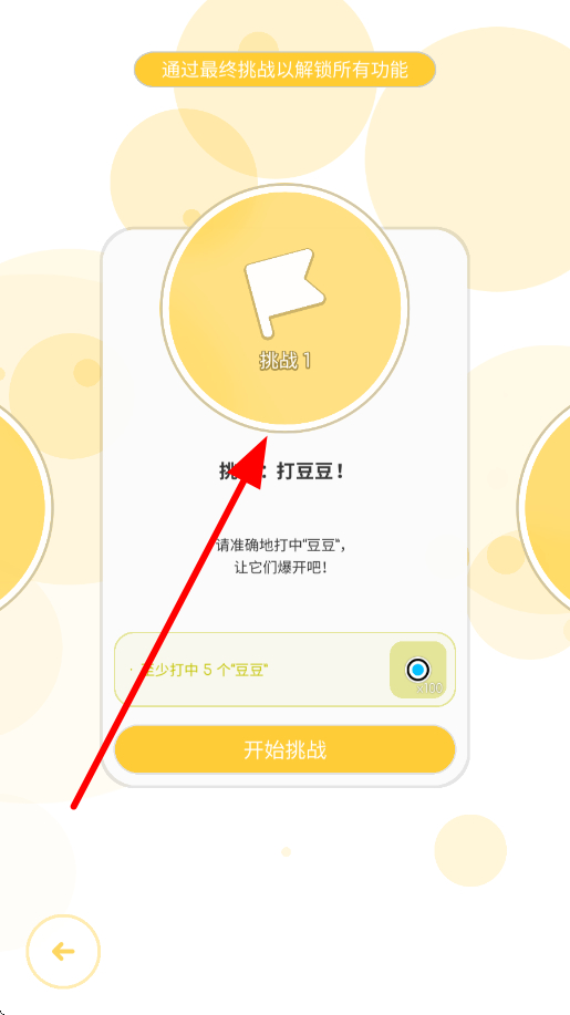2、接着在挑战界面,点击开始挑战,进入挑战场景,根据提示,精准操作去击中如豆豆等目标,让目标爆开,推进挑战进程。