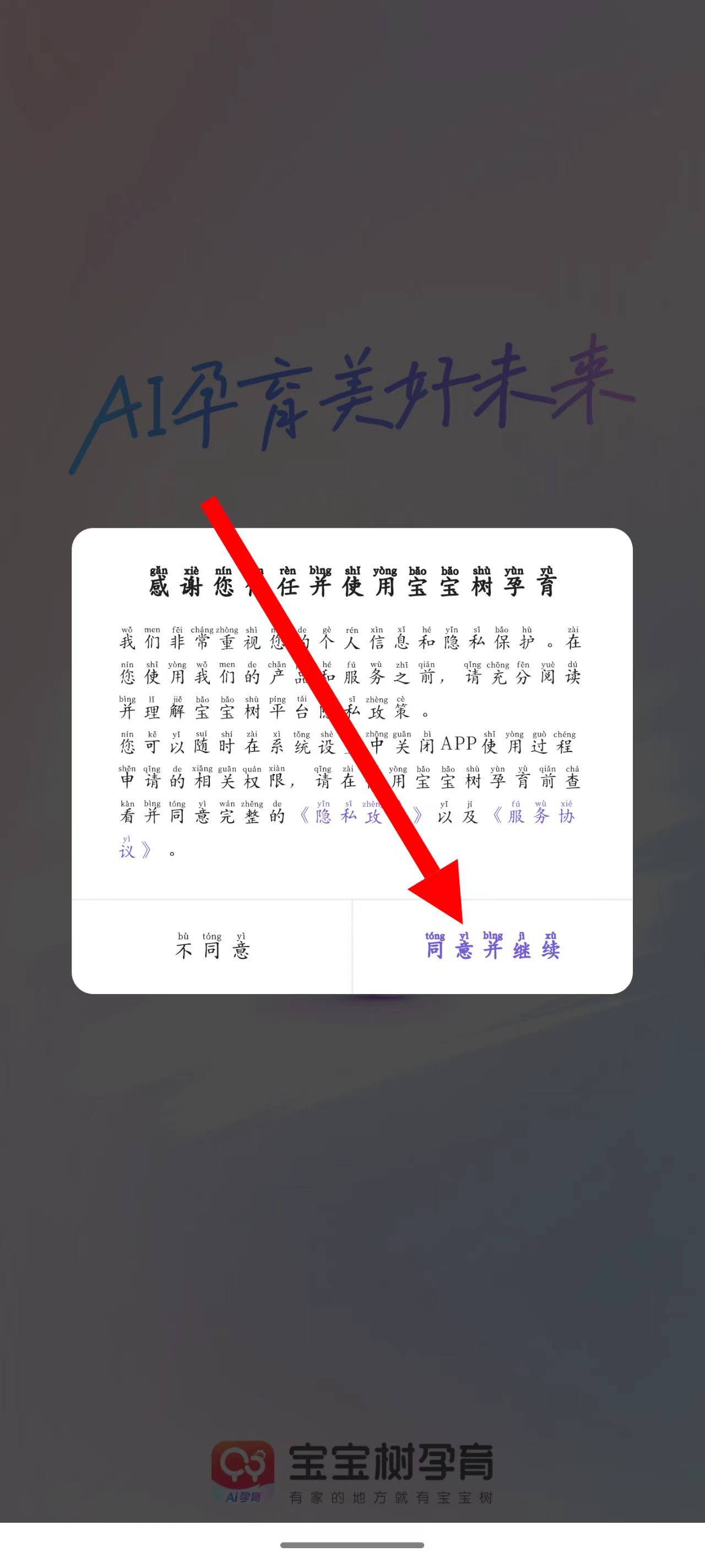 1、打开宝宝树孕育,点击同意并继续。