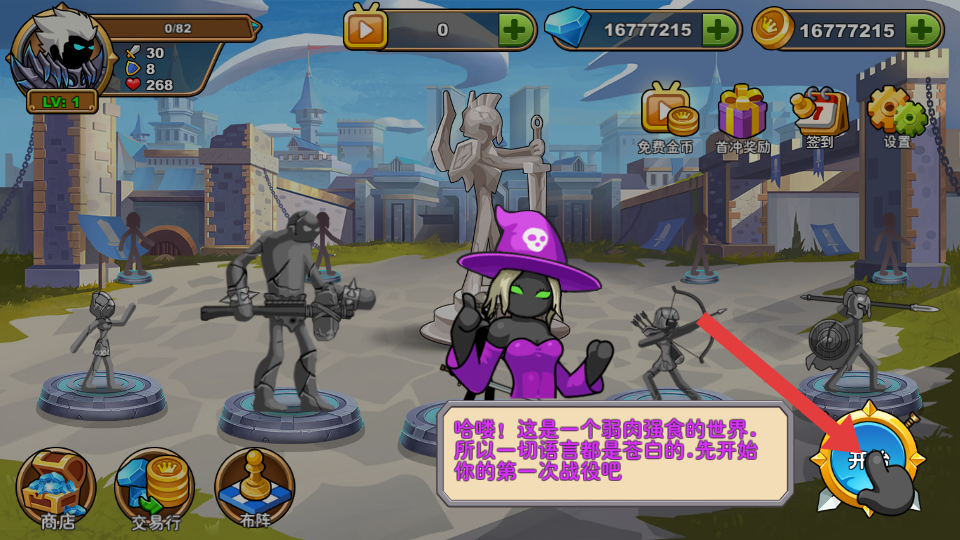 1、在策略格斗游戏的主界面,点击开始按钮进入游戏,开启第一次战役,界面中可看到多种功能按钮。