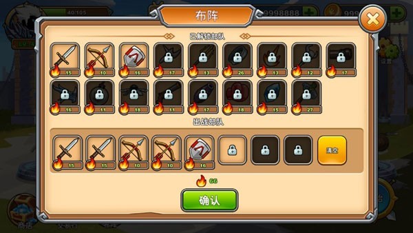 2、兵种布阵与攻坚:利用布阵功能搭配不同兵种,每次通关关卡后会解锁对应关卡的兵种,可自由选择出战部队,配合英雄一同攻克了敌方的城池。