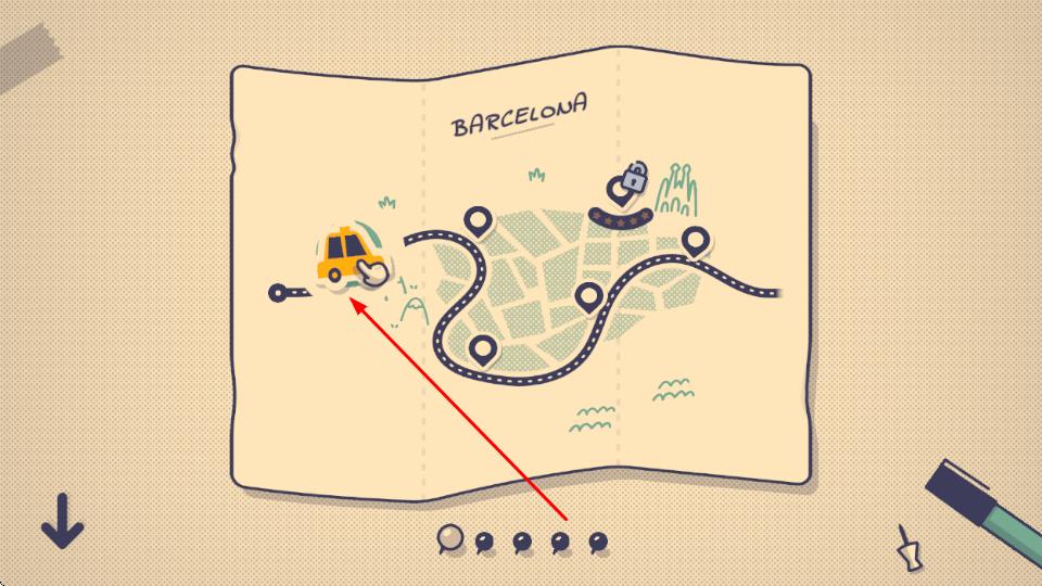 2、接着会看到以巴塞罗那为背景的地图界面,上面有代表出租车的图标和待解锁的路线,你需要选择区域,前往接送乘客。