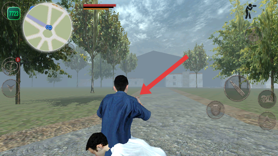 1、在动作冒险游戏中,角色可使用武器按钮发起攻击,在公园场景中与敌人战斗,这是提升战斗能力。