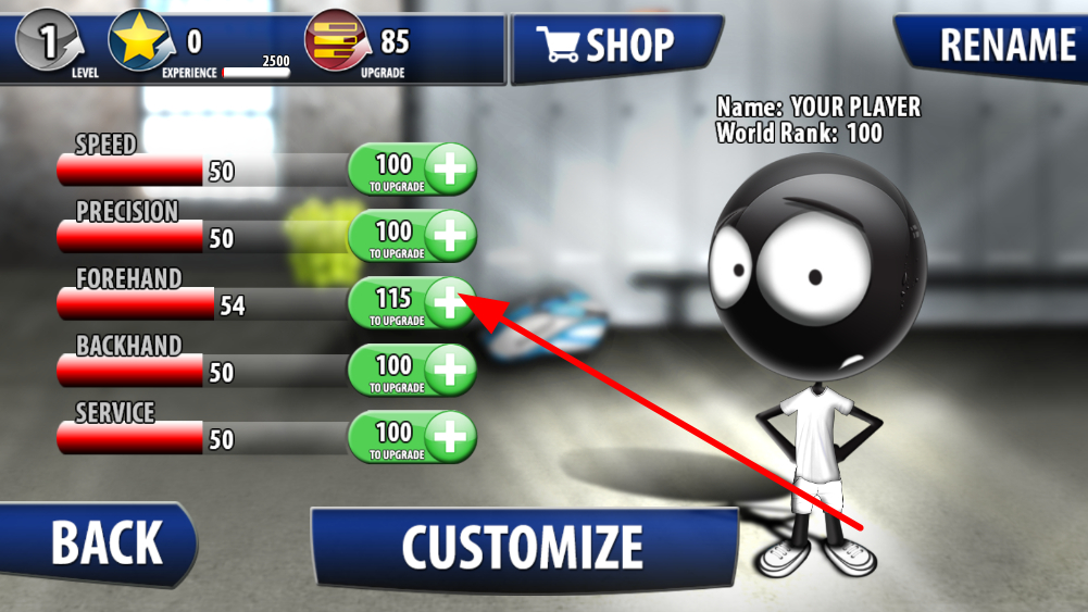 1、可对速度、精准度、正手、反手、发球等属性升级,消耗对应的升级资源,点击属性旁的加号,增强角色在网球对战中的各项能力。