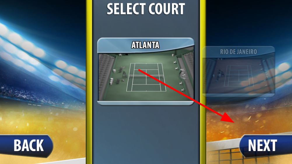 3、在赛事选择界面,有不同的场地可供选择,挑选好想要参与的场地后,点击下一步按钮,进入对应的网球赛事准备阶段。