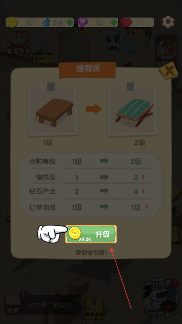2、在整理好的澡堂内找到搓背床,比如特定材料数量或金币数额,确认自身背包内资源充足后,点击界面上的升级按钮,等待短暂的升级进度条走完,查看升级后搓背床的优化效果。